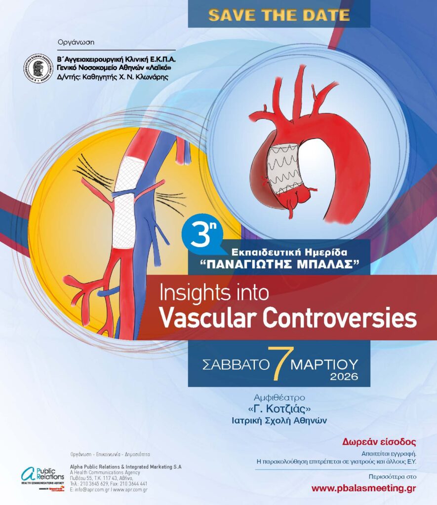 Η Β’ Αγγειοχειρουργική Κλινική Ε.Κ.Π.Α. του Γ.Ν.Α. «Λαϊκό» διοργανώνει την 3η επιστημονική ημερίδα «Παναγιώτης Μπάλας» με φετινό θέμα «Insights into Vascular Controversies», η οποία θα πραγματοποιηθεί στις 7 Μαρτίου 2026, στο Αμφιθέατρο Φυσιολογίας «Γ. Κοτζιάς» (Κτήριο 15) εντός της Ιατρικής Σχολής Αθηνών.